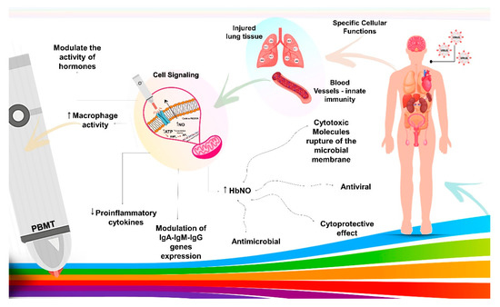 The effect of PBMT is due to its absorption by tissues through photoreceptors, facilitating events such as mitochondrial respiration, calcium transport—which results in more significant cell proliferation—repairing, and regenerating tissues [12,13,14,15]. PBMT has to assist in the recovery process from nerve [16,17,18], bone [19,20,21], respiratory tract [22,23,24,25], and other injuries involved in functional rehabilitation, favoring the patient’s recovery. LLLT can be used with the ILIB technique (Intravascular Laser Irradiation of Blood), which increases immunity, inducing positive effects on the expression of immunoglobulins (IgA, IgM and IgG) and modulation of inflammation. Therefore, this technique can be used to treat various pathogens such as infectious diseases, bronchitis, and pneumonia [26].