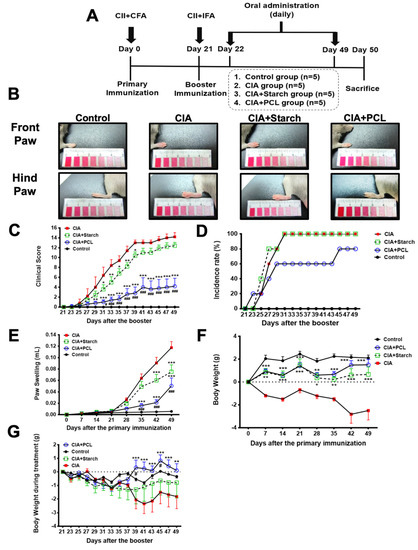 Treatment with PCL ameliorates clinical severity in CIA mice. DBA/1J mice were immunized with 100 µg of bovine type II collagen (CII) in Freund’s complete adjuvant. The mice were orally administered 200 mg/kg/day PCL or starch. (A) Chart showing the experimental design and treatment protocols. (B) Morphological changes in the diseased front and hind limbs. Front paws and hind paws are shown in the photos. (C) The severity of arthritis was evaluated by assigning a score of 0–4 per paw based on the degree of inflammation in each limb, with 0 indicating no arthritis and 4 indicating severe arthritis, for a maximum score of 16 per mouse. (D) Incidence of disease in the mice. (E) Average changes in paw volume. (F) Average changes in body weight from day 0–day 49. (G) Average changes in body weight from day 21–day 49 during the treatment. The data represent the mean ± SEM (n = 5 per group). * p < 0.05, ** p < 0.01, *** p < 0.001 vs. CIA group; # p < 0.05, ### p < 0.001 vs. CIA + Starch group.