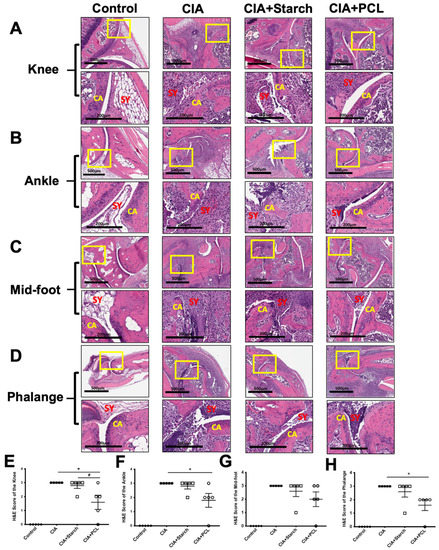 Histological parameters in the diseased hind limb joints. Hematoxylin and eosin staining (H&E staining) of representative mouse hind paws. CIA mice showed hyperplasia of the synovial tissue and increased synovitis and cartilage erosion. (A) Knee, (B) Ankle, (C) Mid-foot, and (D) Phalange in each group. The data are presented in (E–H) as the mean ± SEM (n = 5 per group), * p < 0.05 vs. CIA group; # p < 0.05 vs. CIA + Starch group. SY stands for the position of synovial membrane. CA represent for the position of cartilage.