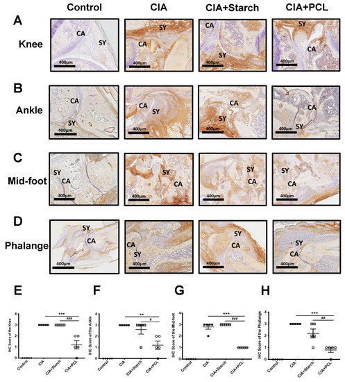 Histological parameters in the diseased hind limb joints. Immunohistochemical analysis of IL-17 in the joints of mice in each group. The levels of IL-17 in mouse joints after PCL treatment. IL17A is strongly positive for synovial cartilage markers (50–100%) in inflammatory areas. (A) Knee, (B) Ankle, (C) Mid-foot, and (D) Phalange in each group. The data are presented in (E–H) as the mean ± SEM (n = 5 per group), ** p < 0.01, *** p < 0.001 vs. CIA group; # p < 0.05, ## p < 0.01, ### p < 0.001 vs. CIA + Starch group. SY stands for the position of synovial membrane. CA represent for the position of cartilage.