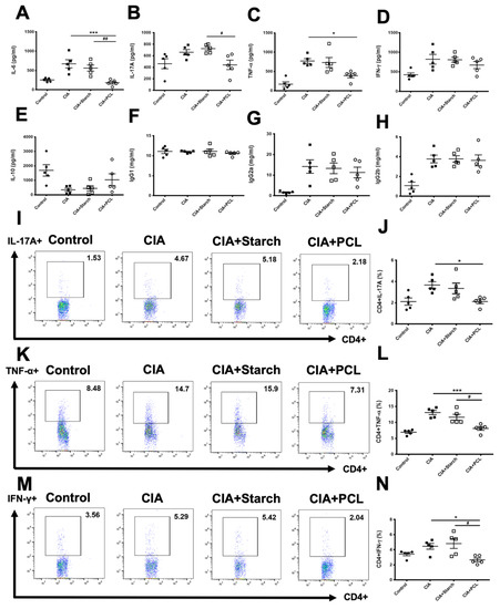 We next measured serum levels of cytokines in CIA mice by ELISA (Figure 5A–H). The CIA + PCL group had significant reductions in the serum levels of IL-6 (Figure 5A) and IL-17A (Figure 5B) compared with the CIA + Starch group. The CIA + PCL group also had a significant reduction in the serum level of TNF-α (Figure 5C) compared with that in the CIA group. However, there was no significant difference in the level of IFN-γ (Figure 5D). The level of IL-10 seemed to be upregulated in the CIA + PCL group but the difference was not significant (Figure 5E). The level of IgG1, IgG2a and IgG2b were not different among the CIA, CIA + Starch and CIA + PCL groups (Figure 5F–H). We further used intracellular staining to investigate the levels of CD4 + IL-17A+, CD4 + TNF-α+ and CD4 + IFN-γ+ isolated from the spleen on day 50. The results showed that the CIA + PCL group had significant reductions in the percentages of CD4 + IL-17A+ cells compared to those in the CIA group (Figure 5I,J). The CIA + PCL group also had reductions in the percentages of CD4 + TNF-α+ (Figure 5K,L) and CD4 + IFN-γ+ (Figure 5M,N) cells compared to those in the CIA group or CIA + Starch group. However, the percentages of CD4 + Fop3+ cells were not significantly different among each group (data not shown). Taken together, these results suggested that PCL could reduce proinflammatory cytokines.