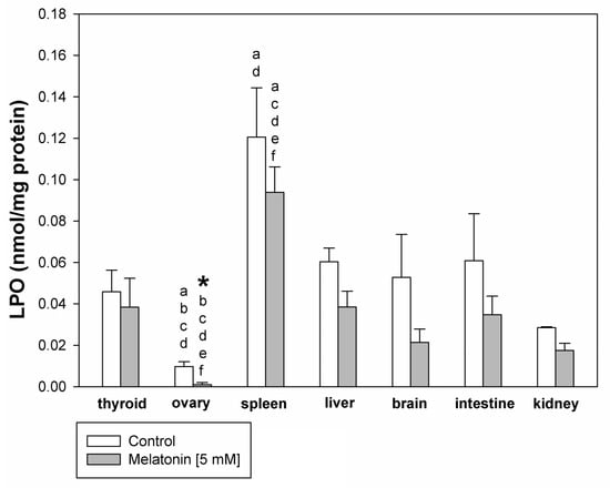 Lipid peroxidation, measured as MDA + 4-HDA level, in homogenates of porcine tissues (thyroid, ovary, spleen, liver, brain, small intestine, kidney), incubated without any substance (control; white bars), or with melatonin [5 mM] (grey bars). *—p < 0.05 vs. control (without melatonin) in the same tissue; a—p < 0.05 vs. respective bar (control or melatonin) in the thyroid; b—p < 0.05 vs. respective bar (control or melatonin) in the spleen; c—p < 0.05 vs. respective bar (control or melatonin) in the liver; d—p < 0.05 vs. respective bar (control or melatonin) in the kidney; e—p < 0.05 vs. respective bar (control or melatonin) in the brain; f—p < 0.05 vs. respective bar (control or melatonin) in the intestine.