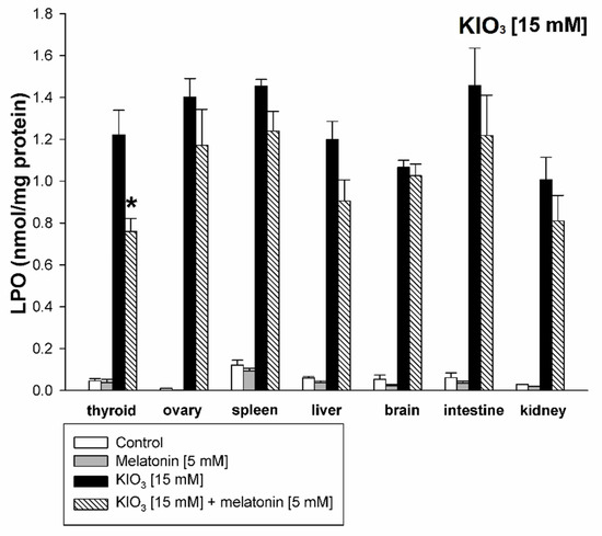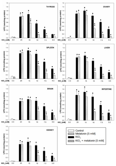In our previous studies [20,22] we observed, that melatonin was able to reduce oxidative damage to membrane lipids caused by KIO3, when this prooxidant was used in doses close to physiological concentrations of iodine in the thyroid. In the present study we decided to compare the protective effects of melatonin against KIO3-induced oxidative damage to membrane lipids in various porcine tissues, i.e., in the thyroid, the ovary, the liver, the kidney, the brain, the spleen, and the small intestine. KIO3 was used in the range of concentrations comprising those corresponding to physiological iodine concentration in the thyroid, whereas melatonin was used in the highest achievable in vitro concentration (i.e., 5 mM).