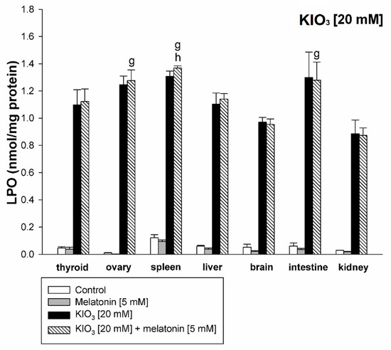 Lipid peroxidation, measured as MDA + 4-HDA level, in homogenates of porcine tissues (thyroid, ovary, spleen, liver, brain, small intestine, kidney), incubated without any substance (control; white bars), or with melatonin (5 mM) (grey bars), or with KIO3 (20 mM) (black bars), or with KIO3 (20 mM) + melatonin (5 mM) (striped bars). g—p < 0.05 vs. KIO3 (20 mM) + melatonin (5 mM) in kidney; h—p < 0.05 vs. KIO3 (20 mM) + melatonin (5 mM) in brain.