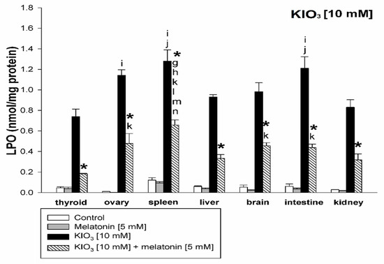 Lipid peroxidation, measured as MDA + 4-HDA level, in homogenates of porcine tissues (thyroid, ovary, spleen, liver, brain, small intestine, kidney), incubated without any substance (control; white bars), or with melatonin [5 mM] (grey bars), or with KIO3 [10 mM] (black bars), or with KIO3 [10 mM] + melatonin [5 mM] (striped bars). *—p < 0.05 vs. KIO3 in the same tissue; i—p < 0.05 vs. KIO3 [10 mM] in thyroid; j—p < 0.05 vs. KIO3 [10 mM] in kidney; g—p < 0.05 vs. KIO3 [10 mM] + melatonin [5 mM] in kidney; h—p < 0.05 vs. KIO3 [10 mM] + melatonin [5 mM] in brain; k—p < 0.05 vs. KIO3 [10 mM] + melatonin [5 mM] in thyroid; l—p < 0.05 vs. KIO3 [10 mM] + melatonin [5 mM] in ovary; m—p < 0.05 vs. KIO3 [10 mM] + melatonin [5 mM] in liver; n—p < 0.05 vs. KIO3 [10 mM] + melatonin [5 mM] in intestine.