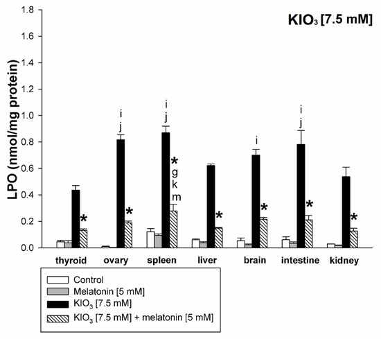 Lipid peroxidation, measured as MDA + 4-HDA level, in homogenates of porcine tissues (thyroid, ovary, spleen, liver, brain, small intestine, kidney), incubated without any substance (control; white bars), or with melatonin [5 mM] (grey bars), or with KIO3 [7.5 mM] (black bars), or with KIO3 [7.5 mM] + melatonin [5 mM] (striped bars). *—p < 0.05 vs. KIO3 in the same tissue; i—p < 0.05 vs. KIO3 [10 mM] in thyroid; j—p < 0.05 vs. KIO3 [10 mM] in kidney; g—p < 0.05 vs. KIO3 [10 mM] + melatonin [5 mM] in kidney; k—p < 0.05 vs. KIO3 [10 mM] + melatonin [5 mM] in thyroid; m—p < 0.05 vs. KIO3 [10 mM] + melatonin [5 mM] in liver.