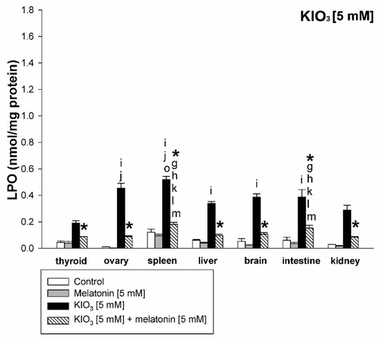Lipid peroxidation, measured as MDA + 4-HDA level, in homogenates of porcine tissues (thyroid, ovary, spleen, liver, brain, small intestine, kidney), incubated without any substance (control; white bars), or with melatonin [5 mM] (grey bars), or with KIO3 [5 mM] (black bars), or with KIO3 [5 mM] + melatonin [5 mM] (striped bars). *—p < 0.05 vs. KIO3 in the same tissue; i—p < 0.05 vs. KIO3 [10 mM] in thyroid; j—p < 0.05 vs. KIO3 [10 mM] in kidney; o—p < 0.05 vs. KIO3 [10 mM] in liver; g—p < 0.05 vs. KIO3 [10 mM] + melatonin [5 mM] in kidney; h—p < 0.05 vs. KIO3 [10 mM] + melatonin [5 mM] in brain; k—p < 0.05 vs. KIO3 [10 mM] + melatonin [5 mM] in thyroid; l—p < 0.05 vs. KIO3 [10 mM] + melatonin [5 mM] in ovary; m—p < 0.05 vs. KIO3 [10 mM] + melatonin [5 mM] in liver.