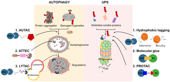 Other approaches using autophagy have been reported such as autophagosome-tethering compound (ATTEC) and lysosome-targeting chimaeras (LYTAC) [24]. ATTEC molecules bind to both the POI and the autophagosome protein LC3, which combines the POI to the autophagosome and consequently induces autophagy. On the other hand, LYTAC is a hetero-bifunctional molecule that targets extracellular and membrane-associated proteins using conjugates that utilize the endosome/lysosomal pathways by binding both a cell-surface lysosome-shuttling receptor and the POIs [24].