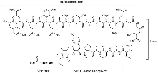 Much effort has been directed toward the elimination or inhibition of tau protein synthesis because tau protein is one of the major pathological proteins in AD. In 2016, Chu et al. reported the first targeted protein degradation system for tau protein using a peptide-based PROTAC compound [25], which consists of four motifs: (i) tau recognition motif, (ii) linker, (iii) E3 ligase-binding motif, and (iv) cell-penetrating peptide (CPP) motif. To select the optimal tau recognition peptide, three known peptides were evaluated and the peptide corresponding to the YQQYQDATADEQG sequence was determined to be the best in their study. Two E3 ligases, Skp1-cullin-F box (SCF) ligase and the von Hippel–Lindau (VHL) tumor suppressor protein, with binding peptide sequences of DRHDS(p)GLDS(p)M and ALAPYIP, respectively, were analyzed. The results showed that VHL is superior to SCF. With a short linker sequence (GSGS) between the tau-binding motif, E3 ligase-binding motif, and polyarginine CPP, the most active PROTAC compound, TH006, was established, which has a 32-amino-acid sequence (Figure 2). TH006 was demonstrated to successfully penetrate into cells and induce tau protein degradation by enhancing polyubiquitination by VHL E3 ligase. Moreover, in an AD transgenic mouse model, it was proven to reduce the neurotoxicity of Aβ through TU005-mediated lowering of the tau protein level.