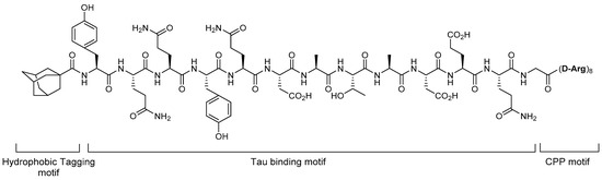 The HyT technology was demonstrated to be effective in tau protein degradation. In 2017, Gao et al. reported the degradation of tau protein by an HyT degrader adopting a hydrophobic tag [26,27]. They designed the tau protein degrader by tethering a tau-binding motif to a hydrophobic adamantyl tag at the N-terminal and poly-D-arginine CPP motif. In this HyT-Tau-CPP compound (Figure 3), the linker was not considered and YQQYQDATADEQG was chosen as the tau protein-binding sequence. To investigate the cellular degradation of tau protein by HyT-Tau-CPP, the authors incubated tau-EGFP-overexpressing Neuro2a cells with the compound at increasing concentrations and different times. The western blot analysis of tau protein and flow cytometry assay showed that HyT-Tau-CPP decreased the tau protein in dose- and time-dependent manners. Further, to prove whether the degradation of tau protein by HyT-Tau-CPP is mediated by the UPS, a co-treatment experiment with a proteasome inhibitor, MG132, was performed. The results showed no degradation of the target protein, which indicated that HyT-Tau-CPP degraded the tau protein through the UPS.