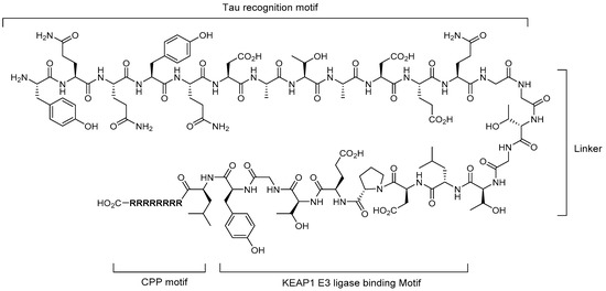 In 2018, Lu et al. reported a peptide-based PROTAC adopting a Keap1 E3 ligase-binding motif, which targets tau protein as the POI [28]. Keap1 (Kelch-like ECH-associated protein 1) is one of the adapter proteins in the Cul3-RING ubiquitin ligase complex and is well known because the Keap1-Nrf2 pathway has cell-protecting functions against various xenobiotic and oxidative stresses that result in neurodegenerative diseases and cancers [29]. In this study, the authors used the Keap1 E3 ligase as a PROTAC technology platform and attempted to prove its potential applications. The overall construct of Tau-Keap1-CPP PROTAC is similar to that previously reported in 2016 [16], in which the VHL E3 ligase-binding motif was adopted. The only difference was that the Keap1-binding motif (LDPETGEYL) was adopted instead of the VHL E3 ligase-binding motif (Figure 4).
