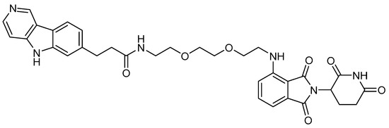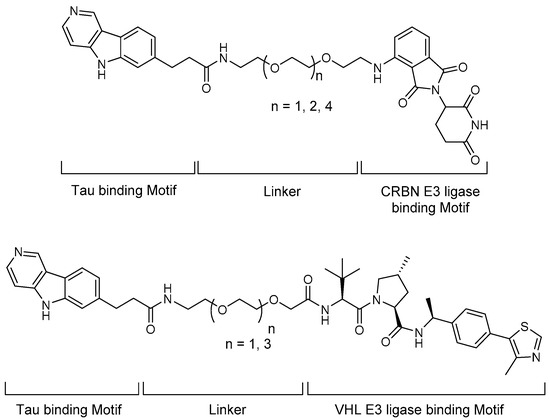 In 2019, the first all-small-molecule PROTAC as a tau protein degrader was introduced and briefly reviewed in a “Patent Highlight” article by R.B. Kargbo (Figure 5) [30]. The original report was titled “Compounds for Tau protein degradation” [31]. In this article, six key Tau-targeting PROTACs were selected and the structures were shown. A pyridoindole moiety was introduced as a Tau-binding motif, small-molecule cereblon (CRBN) and VHL binders were implemented, and the two moieties were tethered through polyethylene glycol (PEG)-based linkers. In the degradation experiment using human Tau-P301L and Tau-A152T neurons, hyperphosphorylated and total tau proteins were successfully eliminated by the developed PROTACs. To verify the potential clinical applications of the compounds, an in vivo pharmacokinetic study was performed in mice, which demonstrated several favorable pharmacokinetic parameters, with B/P values of 1.2 and 1.1 based on Cmax and AUC0-last.