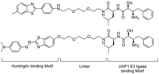 Small-molecule PROTACs have been shown to induce degradation of huntingtin in fibroblasts from HD patients. Tomoshige et al. designed huntingtin-PROTACs (Htt-PROTACs) in which 6-methyl-2-phenylbenzo[d]thiazole and (E)-2-(4-(N,N-dimethylamino)phenyldiazenyl)benzo[d]thiazole were introduced as the targeting ligand (warhead moiety); the dipeptidyl bestatin analogue of cellular inhibitor of apoptosis protein 1 (cIAP1) was adopted as an E3 ligase binder and the two moieties were tethered by PEG-based linkers (Figure 7) [33,34].