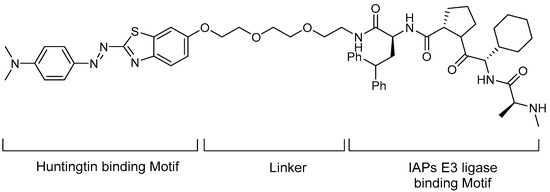 In 2018, the same group introduced a new Htt-PROTAC and published its mHtt degradation results [35]. Compared with the previous Htt-PROTAC, the E3 ligase was changed to IAPs and the known IAP antagonist MV1 was introduced as an E3 ligase binder. MV1 exhibits stronger affinity to cIAP1 than the bestatin analogues used in the previous Htt-PROTAC, and it also interacts with other IAPs. The new Htt-PROTAC is shown in Figure 8, in which (E)-2-(4-(N,N-dimethylamino)phenyldiazenyl)benzo[d]thiazole was used as POI binder and PEG linker. The authors evaluated whether the synthesized PROTAC degraded the mHtt using fibroblast cells from patients with HD and demonstrated the dose- and time-dependent reduction of mHtt.