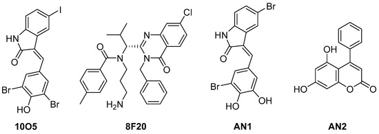 mHTT has been successfully degraded using ATTEC technology [36]. In 2019, Li et al. reported the discovery of mHTT–light chain 3 (LC3) linker compounds (Figure 9) that induce direct binding of mHtt and MAP 1A/1B LC3, and presented the degradation activity of mHtt through lysosome [37]. To identify small-molecule linker compounds, they performed microarray-based screening to measure the interaction of the compounds with purified human LC3B protein, a control wild-type Htt exon 1 fragment, and a pathogenic mHTT exon 1 fragment with an expanded polyQ protein with 3375 compounds. Two hits were identified from the microarray-based screening and two additional compounds were obtained by screening compounds that showed structural similarity with the hits. Allele-selective lowering of mHTT protein by HTT–LC3 linker compounds was observed in cultured primary cortical neurons, and the degradation pathway was predicted to be via autophagy. The in vivo anti-HD effects were further investigated using an HD-knock-in mouse model through two administration pathways (intracerebroventricular and intraperitoneal injections), which revealed considerable lowering of mHtt levels in the cortices of HD mice. The linker compounds 10O5 and AN2 were proven to penetrate the blood–brain barrier.