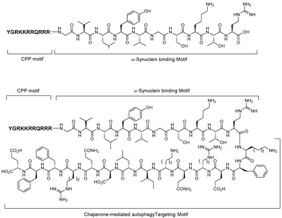 In 2014, peptide-directed lysosomal degradation of α-synuclein (18 kDa) with an appropriate peptide binder was reported by Fan et al. [38] The peptide degrader consists of three motifs: cell membrane-penetrating peptide motif (TAT-CPP, sequence: YGRKKRRQRRR) that allows peptides to cross the blood–brain barrier and plasma membrane, α-synuclein-binding motif (α-syn-BM, sequence: GVLYVGSKTR), and chaperone-mediated autophagy-targeting motif (CMA-TM, sequence: KFERQKILDQRFFE) that directs the target proteins to the lysosomal proteolytic machinery through the peptide–protein interaction (Figure 10). The authors synthesized several peptides for target protein and α-synuclein degradation, with CPP-α-synBM as a negative control compound and TAT-CPP-α-synBM-CMA-TM as a degrader. An in vitro experiment using cultured neurons demonstrated that TAT-CPP-α-synBM-CMA-TM successfully and specifically decreased the α-synuclein levels without disturbing the PSD-95 protein, whereas CPP-α-synBM slightly increased the α-synuclein level in western blot analysis.
