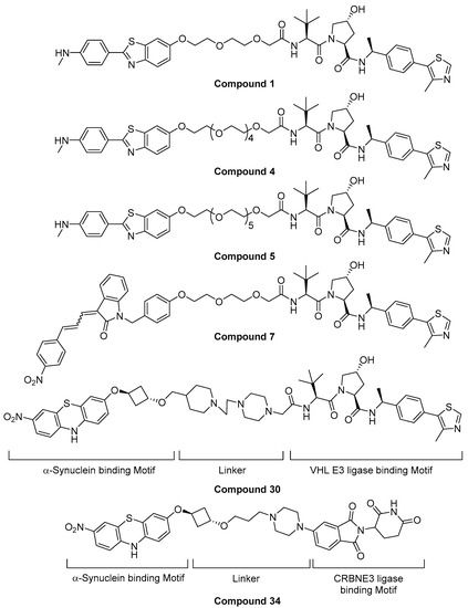 In 2020, a small-molecule PROTAC targeting α-synuclein protein was briefly reviewed as a “Patent Highlight” article by R.B. Kargbo [39]. The original patent was titled by “Proteolysis targeting chimeric (PROTAC) compound with E3 ubiquitin ligase binding activity and targeting alpha-synuclein protein for treating neurodegenerative diseases” by Arvinas Operations, Inc. In this article, six key α-synuclein-targeting PROTACs were selected from the patent. 2-(4-N-methylphenyl)benzothiazole, 1-benzyl-3-(3-(4-nitrophenyl)allylidene)indolin-2-one, and 3-nitro-10H-phenothiazine were introduced as α-synuclein-binding motifs, and small-molecule CRBN and VHL binders were introduced as E3 ligase binders. The two motifs were tethered by PEG or cyclic amine-based linkers. The evaluation of degradation efficacy using HEK293 T-Rex expressing A53T α-syn revealed that >65% of the target protein was degraded at 1 μM by compounds 1, 4, 5, and 34, and >30–65% of the protein was degraded at the same concentration by compounds 7 and 30 (Figure 11).