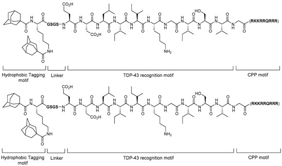 Amyotrophic lateral sclerosis (ALS) is a progressive neurodegenerative disease that is currently incurable. Although the cause of ALS is not yet fully understood, TAR DNA-binding protein (TDP-43) is known to be important in ALS pathogenesis. TDP-43 belongs to the ribonucleoprotein family and is observed as ubiquitinated and hyperphosphorylated cytosolic aggregates in approximately 97% of all patients with ALS. Therefore, TDP-43 is recognized as one of the key targets in ALS. In 2019, Gao et al. reported that the HyT approach degrades the TDP-43 protein (Figure 12) [40]. They designed single and double hydrophobic-tagged TDP-43-binding peptides with cell-penetrating ability. With adamantine as a hydrophobic tag, they searched for optimal linkers between hydrophobic tags, optimal TDP-43-binding peptide sequences, and CPP sequences. Among them, the compound having di-adamantyl as a hydrophobic motif, KGSGS as a linker, EDLIKGISV as a TDP-43-binding motif, and GRKKRRQRRR as a CPP motif was found to induce TDP-43 degradation in cellular assays. Moreover, the degradation reduced the TDP-43-induced toxicity. This report is meaningful because it suggests that the HyT approach can potentially be used as an intervention for ALS.