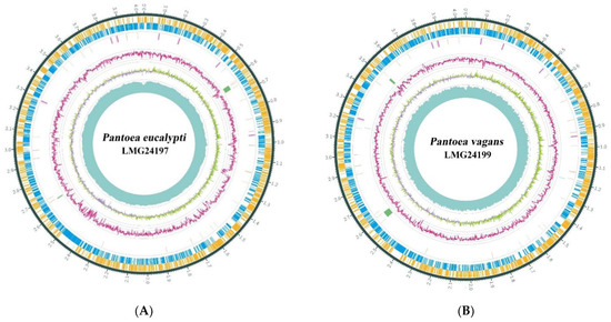 To precisely pinpoint the taxonomic status of FBS135, we did a whole-genome sequencing of two type strains, P. eucalypti LMG 24197T and P. vagans LMG 24199T, which are closely related to FBS135 according to 16S RNA profiling. The statistics showed that the qualities for both of the sequencing and the assembly were satisfactory (Table S1A,B). The genome of P. eucalypti LMG 24197T comprises a single circular chromosome (4,035,995 bp, C+G, 54.6%) and three circular plasmids, named pVag1 (~529 kb), pVag2 (138 kb), and pVag3 (94 kb) (Figure 2A). The genome sequence and the three plasmids are deposited in the DDBJ/EMBL/GenBank database under the accession numbers NZ_CP045720, NZ_CP045721, NZ_CP045722, and NZ_CP04573, respectively. The genome of LMG 24199T comprises a single circular chromosome (4,050,173 bp, C+G, 55.6%) and two circular plasmids, named pEuc1 (~560 kb) and pEuc2 (180 kb) (Figure 2B). The genome sequence and the three plasmids are deposited in the DDBJ/EMBL/GenBank database under the accession numbers NZ_CP038853, NZ_CP038854, and NZ_CP038855, respectively. Genome and plasmid information of the two strains have been summarized in Table 2. Different from the two strains, FBS135 has four plasmids, one (pPant4) of which seems to be responsible and indispensable for its growth [17].