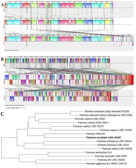 According to these collinearity analysis results, a rootless phylogenetic topology tree was generated (Figure 5C), where FBS135 and P. eucalypti LMG 24197T were clustered in the same clade while LMG 24199T was in another clade. Other type strains were even distant from FBS135. Such results were consistent with their phylogenetic relationships as analyzed above.