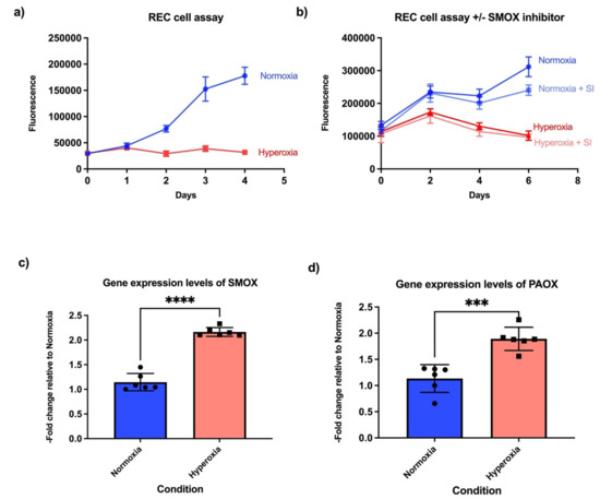 Primary human retinal endothelial cells were purchased from Cell Systems (Kirkland, WA, USA) and used within 4–5 passages. Cells were maintained in endothelial cell medium from Cell Biologics (catalogue number H1168; Chicago, IL, USA). Cells were plated in black 96-well plates overnight and then incubated in a normoxic (21% oxygen) or hyperoxic (75% oxygen) incubator for 4–6 days. Cell proliferation was measured by using a CyQuantTM NF cell proliferation assay kit from Invitrogen (Waltham, MA, USA), following the protocol provided with the kit. A SMOX inhibitor, MDL 72527, was spiked into the medium at a final concentration of 100 µM.