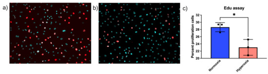 In addition to cell number, we also performed Edu labeling, which labels S-phase cells by incorporating Edu into newly synthesized DNA. Cells were exposed to 24 h of normoxia or hyperoxia, labeled with Edu and analyzed. To count the total number of cells in frame, cells were additionally labeled with Hoechst stain to locate the nuclei of the living cells. There were statistically significantly fewer proliferating cells in hyperoxic conditions compared to normoxic conditions. Edu- and Hoechst-stained merged images of normoxic cells are depicted in Figure 2a and hyperoxic in Figure 2b. Edu- and Hoechst-stained images were merged in Fiji ImageJ in silico [34]. Percentages of Edu-positive cells were quantified using ImageJ and depicted in Figure 2c [35].