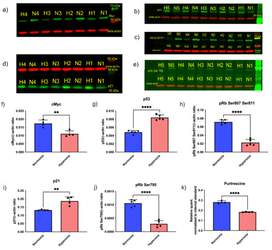 To further confirm that hyperoxia induces cell-cycle arrest, we evaluated the phosphorylation of retinoblastoma protein (Rb). The first step in committing cells to cell division is transition from the G1 to the S phase, which is dependent on phosphorylation of the retinoblastoma (Rb) protein [22,38]. Phosphorylated Rb leads to the increased concentration of E2F elongation factor, thereby signaling translation of the proteins required for the S-phase [22,38]. There are 19 known phosphorylation sites on human Rb1 protein (source: Uniport) [39]; of these, the three most important sites involved in cell-cycle regulation are Ser 807, Ser 811, and Ser 795 [40]. Recent work by multiple teams have highlighted that out of these three sites, Ser 807 and Ser 811 regulate c-Abl binding of Rb1 [38,40]. Ser795 is involved in binding of Rb1 to E2F transcription factor [38,40]. We measured the levels of phosphorylated pRb Ser807/811 (Figure 3c,h) and pRb Ser795 (Figure 3e,j). Both the phosphorylated forms of Rb protein were decreased in response to hyperoxia, indicating cell-cycle arrest in G1 phase. We additionally measured the levels of putrescine and found it to be decreased in hyperoxic conditions (Figure 3k).