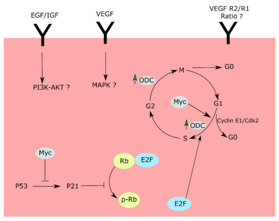 Cell-cycle checkpoints and proposed routes affected by hyperoxia. Hyperoxia downregulates Myc and upregulates P53 proteins, thereby increasing p21 protein levels. P21 further downregulates pRb levels, leading to cell-cycle arrest in the G1 phase. The cell-cycle arrest can be due to anomalies in MAPK and P13K/Akt pathways downstream of VEGF, EFG/IGF receptors. Alternatively, the cell-cycle changes can be a result of an aberrant VEGFR2/R1 ratio.
