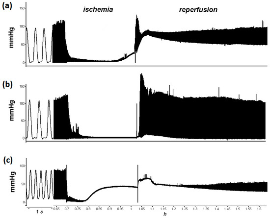 Native records of the left ventricle contractile function of the isolated rat heart during ischemia/reperfusion in control (a), in PAG + L-cysteine (b) and BSO + PAG + L-cysteine (c) groups. Administration of PAG and L-cysteine prevented ischemic contracture of the myocardium and supported complete restoration of contractile activity of the left ventricle, whereas the pretreatment with BSO intensified ischemic contracture of the myocardium and abolished protective effect of PAG + L-cysteine.