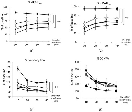 The hearts subjected to I/R exhibited considerably impaired relaxation. Specifically, an intensive contracture was observed during ischemia. At the end of ischemia, the value of EDP averaged 48 mmHg (Figure 2b). At the 40th min of reperfusion, LVDP (Figure 2a) as well as coronary flow (Figure 2e) were restored only to 59% compared to the pre-ischemic values. During all the period of reperfusion, dP/dtmax as well as dP/dtmin were decreased twice (Figure 2c,d). Post-ischemic disturbances of heart function were accompanied with the changes in oxygen metabolism. At the 10th min of reperfusion, OCMW was 240%, if compared to the pre-ischemic values and dropped to 130%at the 40th min of reperfusion, thus indicating ineffective oxygen utilization by the ischemized myocardium (Figure 2f).