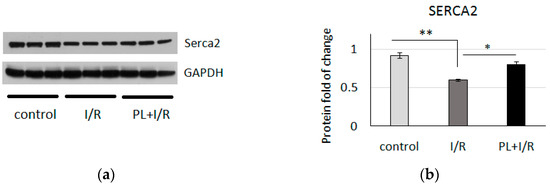 The ischemic contracture was not observed in any experiment in PAG + L-cysteine group (Figure 1b). Notable prevention of post-ischemic disturbances of all monitored parameters was observed. At the 10th min of reperfusion, LVDP restored to 106% ± 3.8% compared to 42.7% ± 21.3% in the control group (p < 0.01) (Figure 2a). EDP averaged 5 mmHg during reperfusion (Figure 2b). It is important to note that improved relaxation of the left ventricle was supported by analysis of SERCA2 protein level, which was increased in heart lysates of PAG + L-cysteine + I/R group compared to I/R hearts (Figure 3). This might indicate sufficient ATP supply and, thus, improved Ca2+ re-entry into sarcoplasmic reticulum in the ischemized myocardium after PAG + L-cysteine pretreatment.