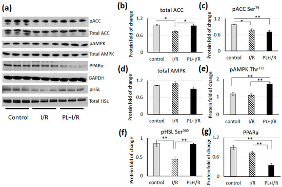 PAG+ L-cysteine pretreatment inhibitedfatty acids β-oxidation in I/R hearts. (a) Western blot of pACC at Ser79, ACC, pAMPK at Thr172, total AMPK, PPARa, pHSL at Ser565 andtotal HSL in heart lysates from control, I/R and PAG + L-cysteine + I/R (PL + I/R) groups. (Original western blot see supplementary Figure S2) (b)Densitometry of total ACC normalized to GAPDH. (c) Densitometry of pACC at Ser79 normalized to total ACC. (d)Densitometry of total AMPK normalized to GAPDH. (e) Densitometry of pAMPK at Thr172 normalized to total AMPK. (f)Densitometry of pHSL at Ser565normalized to total HSL. (g)Densitometry of total PPARa normalized to GAPDH. The data are expressed as the mean ± SEM of arbitrary fold of change relative to control levels. n = 6 to 8 per group. The control hearts were perfused by Langendorff preparation about 20 min, I/R heart underwent 20 min of global ischemia followed by 40 min of reperfusion. Then, lysates for WB were prepared. * p < 0.05, ** p < 0.01 (one-way ANOVA with post hoc Tukey HSD test).