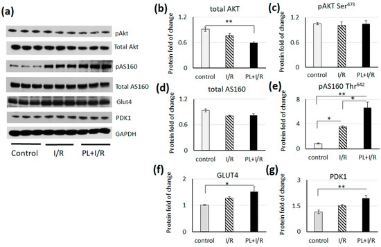 PAG+ L-cysteine pretreatment promoted glucose consumption and glycolysis in I/R hearts. (a) Western blot ofpAKT at Ser 473, total AKT, pAS160 atThr642, total AS160,GLUT4 and PDK1 in whole heart lysates from control, I/R and PAG + L-cysteine + I/R rats. (Original western blot see supplementary Figure S3) (b) Densitometry of total AKT normalized to GAPDH. (c) Densitometry of pAKT at Ser473 normalized to total AKT. (d) Densitometry of total AS160 normalized to GAPDH. (e) Densitometry of pAS160 at Thr642 normalized to total AS160. (f) Densitometry of GLUT4 normalized to GAPDH. (g) Densitometry of total PDK1 to GAPDH. The data are expressed as the mean ± SEM of arbitrary fold of change relative to control levels. n = 6 to 8 per group. Control hearts were perfused by Langendorff preparation about 20 min, I/R heart underwent 20 min of global ischemia followed by 40 min of reperfusion. Then, lysates for WB were prepared. * p < 0.05, ** p < 0.01 (one-way ANOVA with post hoc Tukey HSD test).