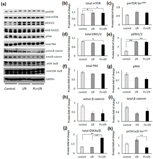 PAG + L-cysteine pretreatment does not affect mTOR, MAPK/Erk1/2 and canonical Wnt signaling activity in the I/R hearts. (a) Western blot of pmTOR at Ser 2448, total mTOR, pErk1/2, total Erk1/2, pPKA, total PKA, active β-catenin, total β-catenin, pGSK3β at Ser21/9 and total GSK3β in whole heart lysates from the control, I/R and PAG + L-cysteine + I/R rats. (Original western blot see supplementary Figure S5) (b) Densitometry of total mTOR normalized to GAPDH. (c) Densitometry of pmTOR at Ser2448 normalized to mTOR. (d) Densitometry of total Erk1/2 normalized to GAPDH. (e) Densitometry of pErk1/2 normalized to total Erk1/2. (f) Densitometry of total PKA normalized to GAPDH. (g) Densitometry of pPKA normalized to total PKA. (h) Densitometry of activeβ-catenin normalized to total β-catenin. (i) Densitometry of total β-catenin normalized to GAPDH. (j) Densitometry of total GSK3α/β normalized to GAPDH. (k) Densitometry of pGSK3α/βatSer21/9 normalized to total GSK3α/β. The data are expressed as the mean ± SEM of arbitrary fold of change relative to control levels. n = 6 to 8 per group. Control hearts were perfused by Langendorff preparation about 20 min, I/R heart underwent 20 min of global ischemia followed by 40 min of reperfusion. Then, lysates for WB were prepared. * p < 0.05, ** p < 0.01 (one-way ANOVA with post hoc Tukey HSD test).