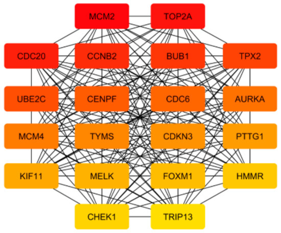 - Chin, C.H.; Chen, S.H.; Wu, H.H.; Ho, C.W.; Ko, M.T.; Lin, C.Y. cytoHubba: Identifying hub objects and sub-networks from complex interactome. BMC Syst. Biol. 2014, 8 (Suppl. S4), S11. [Google Scholar] [CrossRef] [PubMed] [Green Version]