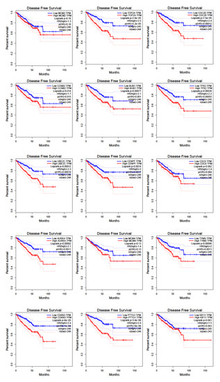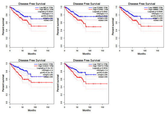 3.5. Prostate Cancer Metastasis Hub Genes and Their Involvement in Patient Disease-Free Survival