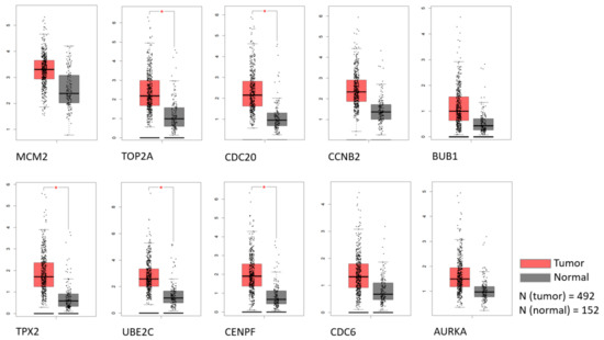 - Tang, Z.; Li, C.; Kang, B.; Gao, G.; Li, C.; Zhang, Z. GEPIA: A web server for cancer and normal gene expression profiling and interactive analyses. Nucleic Acids Res. 2017, 45, W98–W102. [Google Scholar] [CrossRef] [Green Version]