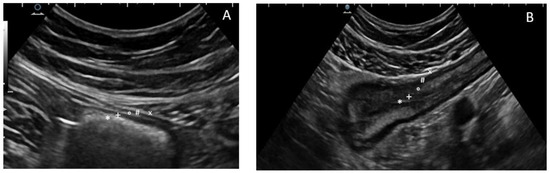 According to the European Federation of Societies for Ultrasound in Medicine and Biology (EFSUMB) guidelines, the examination can be systematically performed with the aim of evaluating the whole intestine, starting from the hypogastrium, or left iliac fossa, firstly assessing the sigmoid colon, and then continuing along the colon to the terminal ileum, appendix, small bowel, and up to the stomach [13,14]. A fasting of 4–6 h is advisable, but not essential, in order to reduce the luminal content, the blood flow, and the peristaltic activity [13,14]. The iliopsoas muscle and the common iliac vessels can be used as landmarks to identify the sigmoid or the terminal ileum in the left or right iliac fossa, respectively. The normal bowel is stratified with five concentric layers that can be distinguished for their echogenicity (Figure 1): the most inner layer identifies the hyperechoic mucosa/lumen interface, while the most outer layer is an echogenic interface between the serosa and the confining organs or structures [15,16]. The BWT is the only fully quantitative ultrasound parameter that is measured from the external hyperechoic layer of the serosa to the internal hyperechoic interface between the lumen content and the mucosa [15,16]. To date, a bowel thickness of 2 mm was established by the EFSUMB guidelines as a threshold for the definition of normality [13]. In contrast, most studies and meta-analyses indicate a cut-off between 3 and 4 mm as a threshold of disease activity, especially for IBD patients [17,18]. In addition, a semi-quantitative grading of intestinal wall vascularity through the Limberg score has been described in the literature and is routinely used in clinical practice (Table 1) [18,19]. The evaluation of the rectum deserves to be discussed separately: the sensitivity of BUS in detecting a rectal location of IBD is approximately 15% [17,18]. Some recent evidence suggested a cut-off of 4 mm of BWT for the rectum, measured transperineally [20].