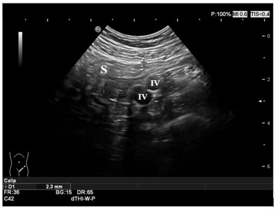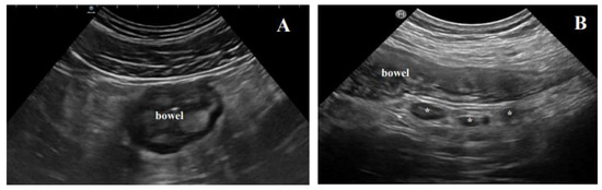 Regarding the evaluation of the bowel diameter, it can considerably vary (i.e., recent meals or fluid intake), but when the small bowel dilated segment becomes larger than 25 mm it is generally considered as abnormal, especially if a reduction in motility is observed, and a large bowel of more than 5 cm is also considered abnormal [14]. With respect to motility, the operator should assess any loss of elasticity and peristaltic movements [13,14]. Finally, among the evaluable extraintestinal features there are mesenteric fat, mesenteric lymph nodes, and abdominal free fluid [13,14]. An example of normal findings at bowel ultrasound of the sigmoid colon is shown in Figure 2.