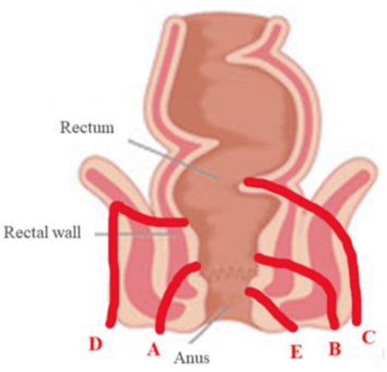 Parks classification of perianal fistulas (40). A: inter-sphincteric; B: trans-sphincteric; C: extra-sphincteric; D: supra-sphincteric; E: superficial perianal fistula.