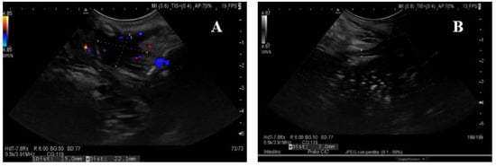 - Sasaki, T.; Kunisaki, R.; Kinoshita, H.; Kimura, H.; Kodera, T.; Nozawa, A.; Hanzawa, A.; Shibata, N.; Yonezawa, H.; Miyajima, E.; et al. Doppler ultrasound findings correlate with tissue vascularity and inflammation in surgical pathology specimens from patients with small intestinal Crohn’s disease. BMC Res. Notes 2014, 7, 363. [Google Scholar] [CrossRef] [PubMed]