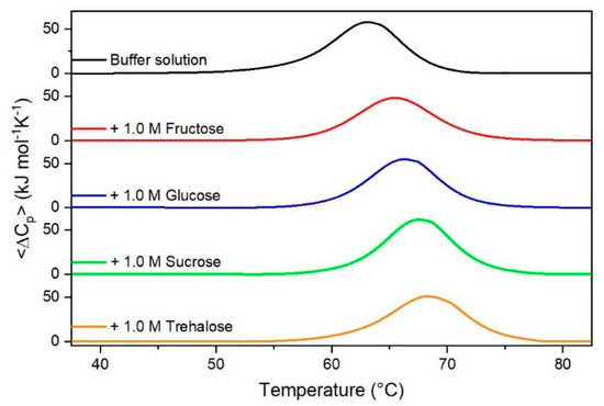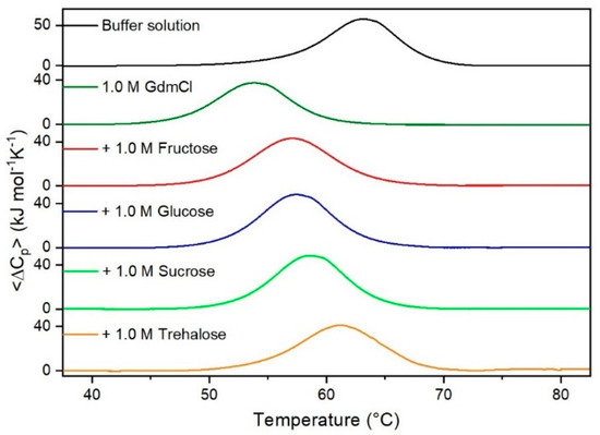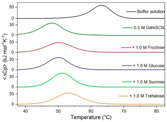 DSC curves of RNase A in 0.5 M GdmSCN in the absence or in the presence of the indicated sugars. For comparison, the DSC profile of the protein in the absence of co-solutes is reported (black curve).
