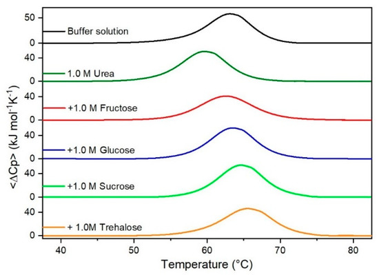 DSC curves of RNase A in 1.0 M urea in the absence or in the presence of the indicated sugars. For comparison, the DSC profile of the protein in the absence of co-solutes is reported (black curve).