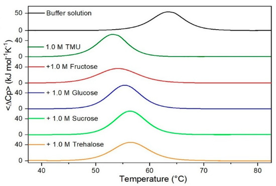 DSC curves of RNase A in 1.0 M TMU in the absence or in the presence of the indicated sugars. For comparison, the DSC profile of the protein in the absence of co-solutes is reported (black curve).