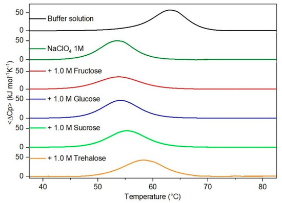 DSC curves of RNase A in 1.0 M NaClO4 in the absence or in the presence of the indicated sugars. For comparison, the DSC profile of the protein in the absence of co-solutes is reported (black curve).