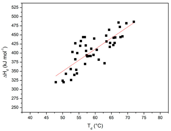 ΔHd(Td) versus Td plot, with values from all the DSC measurements shown here and in [36].