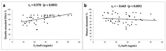 Correlations (rho Spearman’s coefficient) between F2-IsoPs (ng/mL) and double-stranded DNA % (a) and between F2-IsoPs (ng/mL) and mature chromatin (b) (in 49 infertile men) are shown.