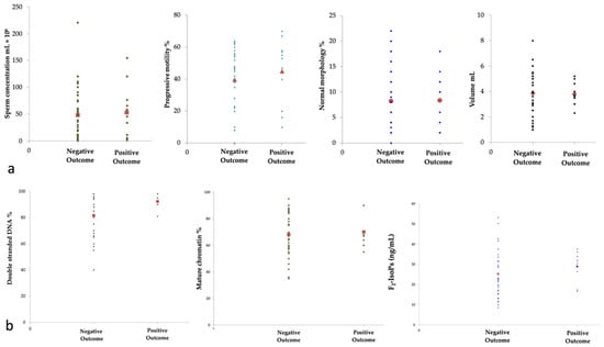 Scatter plots of the variables considered in 49 patients grouped according to assisted reproduction technique (ART) outcome: positive outcome (11 patients) and negative outcome (38 patients). (a) sperm concentration (mL × 106), progressive motility %, normal morphology %, volume (mL) are shown; (b) double stranded DNA %, mature chromatin % and F2-IsoPs (ng/mL) are reported. The red symbols represent the mean of the values. The group with positive outcomes showed increased double stranded DNA % (b) than that observed in the group with negative outcomes (p = 0.002).