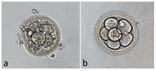 Finally, we grouped patients according to embryo quality: the group with low-quality embryos (18 patients, Veeck’s scale [22] grades 3 and 4, Figure 3a) and the group with good-quality embryos (30 patients, Veeck’s scale [22] grades 1 and 2, Figure 3b). One couple did not obtain any embryo.
