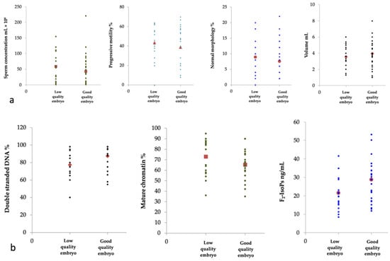 Scatter plots of the variables considered in 48 patients grouped according to embryo quality: low-quality embryos (18 patients) and good-quality embryos (30 patients). (a) sperm concentration (mL × 106), progressive motility %, normal morphology %, volume (mL) are shown; (b) double stranded DNA %, mature chromatin % and F2-IsoPs (ng/mL) are reported. The red symbols represent the mean of the values. The group with good-quality embryos showed increased double stranded DNA % (b, p = 0.046) and F2-IsoP levels (b, p = 0.024) compared to those observed in the group with low-quality embryos.